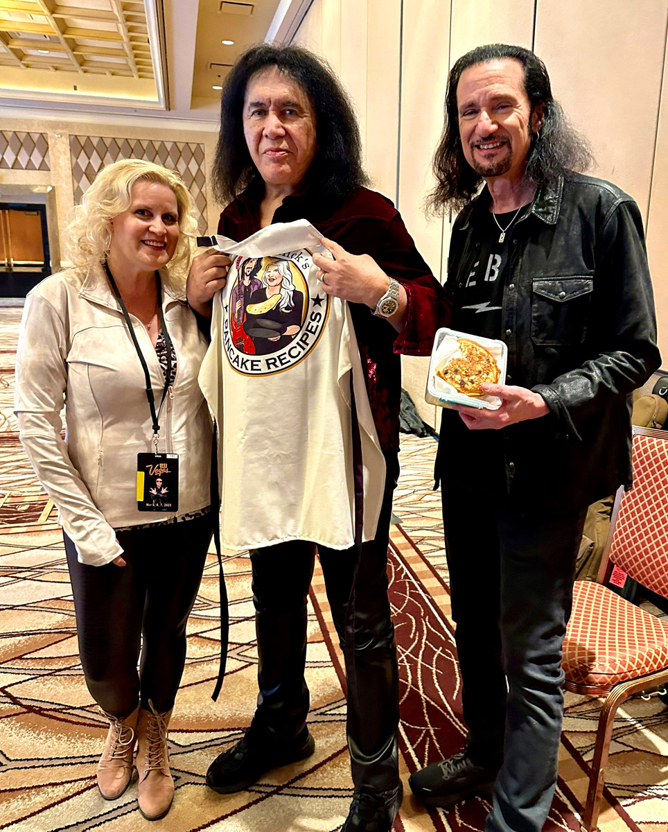 Lisa brought the pancakes as promised, in a Tupperware container, and when Gene came into the large dressing room he enjoyed his fresh blueberry pancakes treat. He posed with the Kulickâs Pancake Recipes apron, and the chat about the recipes and copyrights (Gene always thinking business) was quite funny!