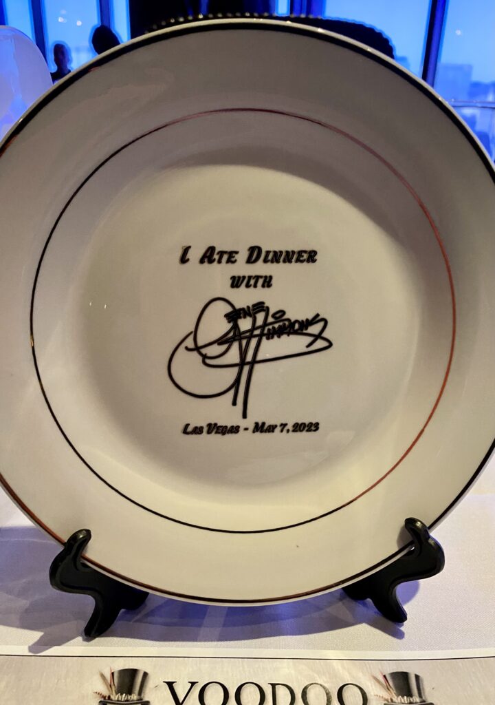 The band and any other guests, were given a table off to the side, and I was able to take a photo of the custom plate that was printed for the ticketed people. The date did say May 7th, but it was May 5th! Gene never got around to ordering plates for the extra dinner he booked. Sort of a time machine dinner LOL!