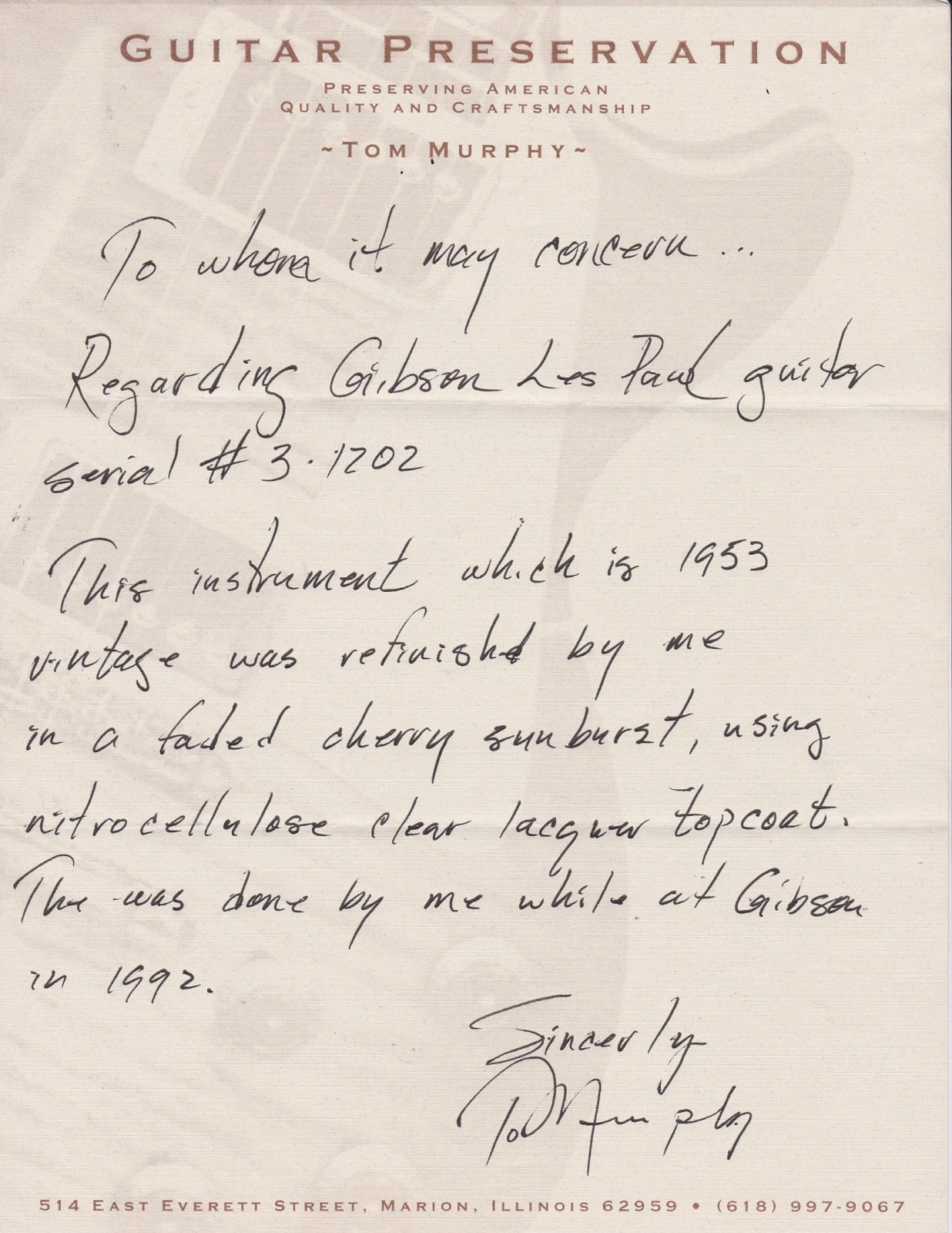 But it was Paul Stanley who introduced me to Tom Murphy, the premiere guitar painter at the Gibson Custom Shop that really did something amazing for the guitar. The relationship with KISS and Gibson was very good at that time, (remember we even played a NAMM event for them in Nashville) and it was possible to ask Tom to strip the older drab finish off and make it look closer to a ’59 Burst, something that is an art in itself. Tom Murphy’s refinish revealed all the amazing grain in the maple wood top, which could never be seen before! Since 1992 I always wished I had a COA from him! I recently saw him at a guitar show in Atlanta, and he gladly provided me with one. (Look for that scan in the photos I shared!)